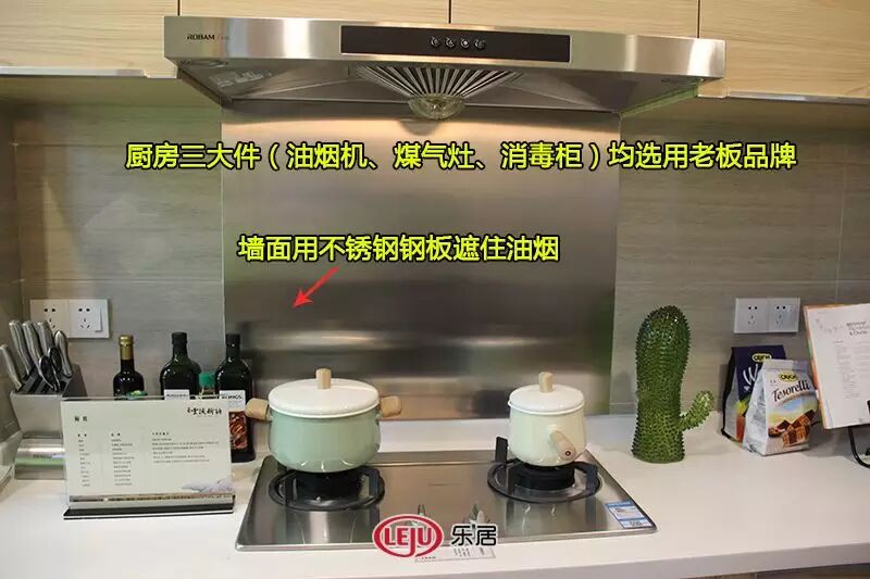 精裝的三大系統之廚房。先來看廚房三大件:油煙機、煤氣灶、消毒柜均選用老板品牌。做菜處的墻面用不銹鋼鋼板擋住油煙,更利于清潔,這面東西雖然造價不高,但是非常實用,為經常在廚房做菜的主人考慮周到。兩邊都有帶開關的插座,方便安全。