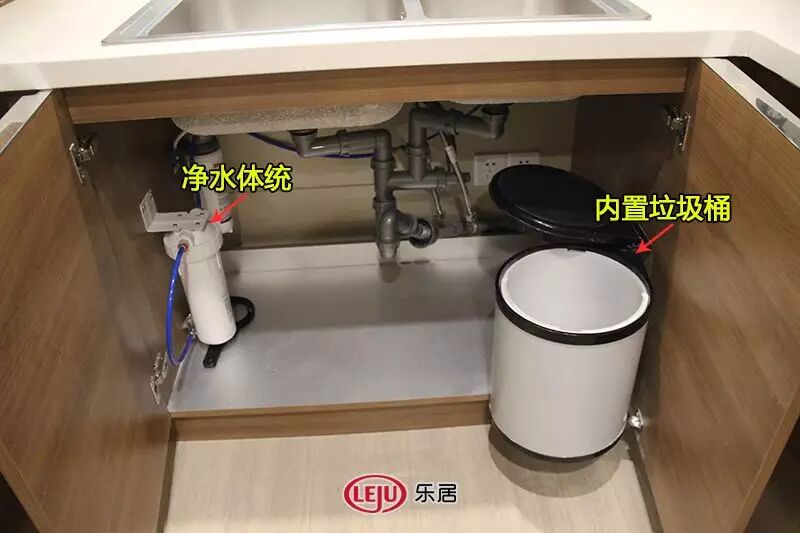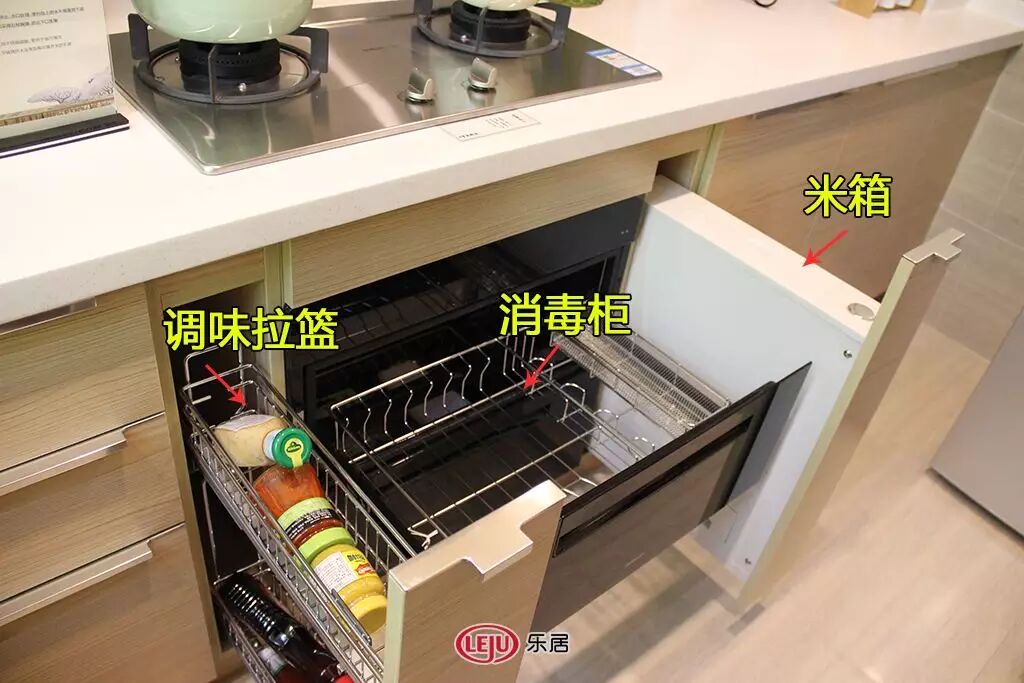 廚房的收納系統還包括內置式的垃圾桶、抽取式的米箱和調味拉籃、餐具抽屜等。