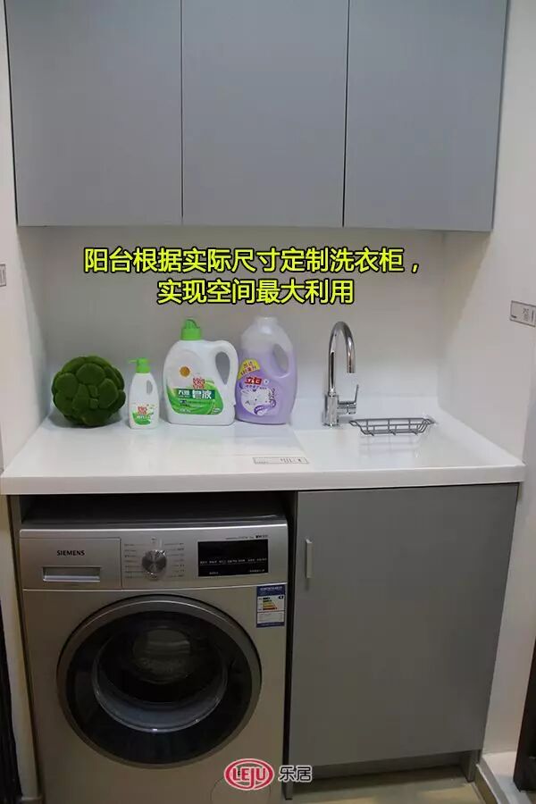 陽臺還設有定制的洗衣柜,實現空間的最大利用。具備水龍頭、皂架、搓衣板等,預留了洗衣機的位置,但只能裝滾筒式洗衣機。