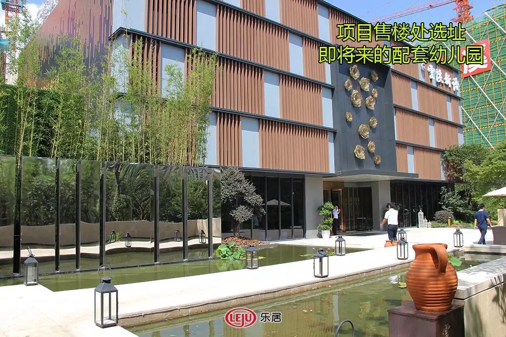 售樓處門口,有小型水景,有大片草坪,棕色的外立面線條與整體相得益彰。而現在看到的這個售樓處,也將是未來小區配套的幼兒園,也就是說先建幼兒園,再建小區。