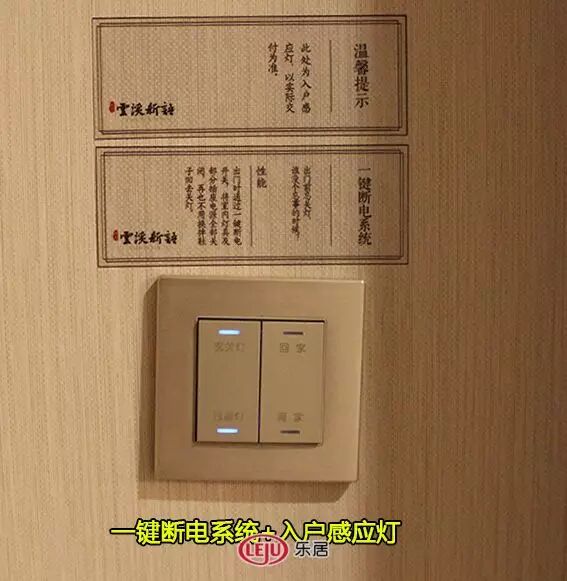 入戶處,設有入戶感應燈,開門后再也不用摸黑找開關。另外還有一鍵斷電系統,出門時通過一鍵斷電開關,將室內燈具及部分插座電源全部關閉,進一步確保室內用電安全。
