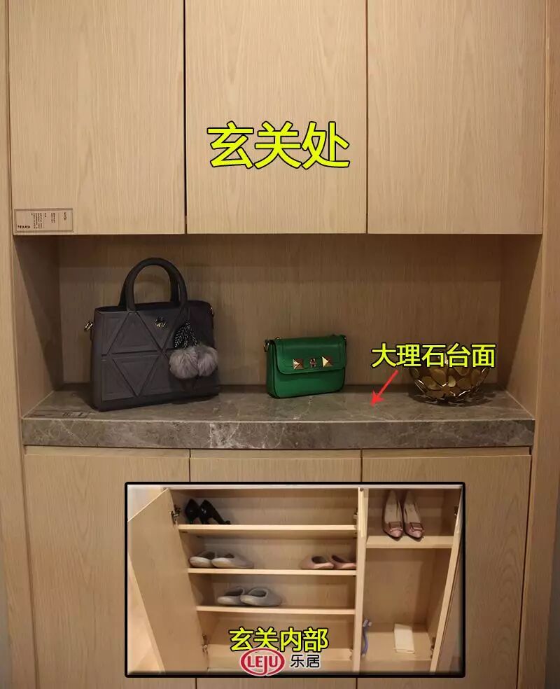 入戶玄關處,組合柜、大理石臺面、鞋柜,儲藏空間還算大,進門后的一些隨身物品都能安置在此處,但這一部分也還有進一步完善的空間:比如增加一個插座或者燈帶。