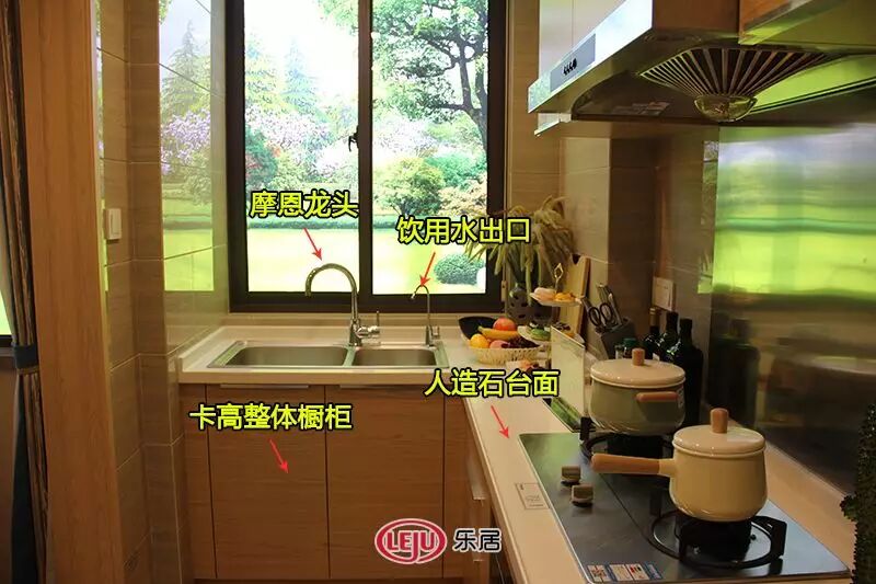 在89㎡的廚房中,圖中水槽所在處的一段地拓展面積,使廚房空間大增,變成了L型廚房。廚房龍頭是美國摩恩的,櫥柜是德國卡高的,層層分裝,甚至高度和寬度都是依據人體工程學來量身定做。