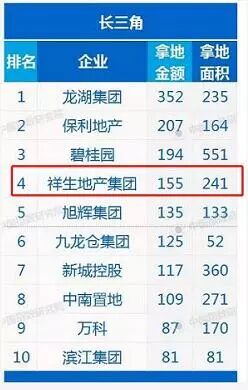 據中國指數研究院4月底發布的《2018年1-4月全國房地產企業拿地排行榜》中,祥生地產以170億元的拿地金額位列TOP10,其中在深耕的長三角區域,祥生更是位列拿地金額排行榜TOP4。