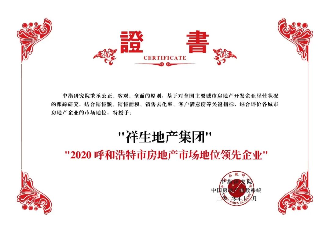 2020年12月3日,由中國房地產指數系統 、中指研究院聯合主辦的“2020第十七屆中國房地產大數據年會暨2021中國房地產市場趨勢報告會”在北京隆重舉行。祥生地產集團憑借穩健的規模增長、精準的拿地布局以及社會責任擔當位列「2020長三角區域房地產50強企業TOP10」「2020浙江房地產10強企業TOP4」,同時榮獲「2020紹興市房地產市場地位領先企業」「2020呼和浩特市房地產市場地位領先企業」「2020鄒城市房地產市場地位領先企業」。